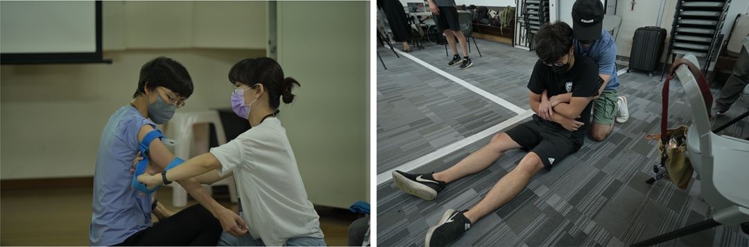 課程內容包含:認識緊急救護概念,強化非戰鬥人員自救互救的能力,並於課程中進行止血帶操作、傷患包紮、傷患搬運練習。